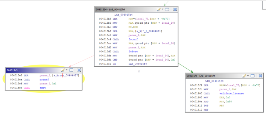 After that, fclose function will try to close the opened file, if the return value of the fclose isn’t 0x0, we will go to the validate_license function. So we will go to the LAB_004015f9,