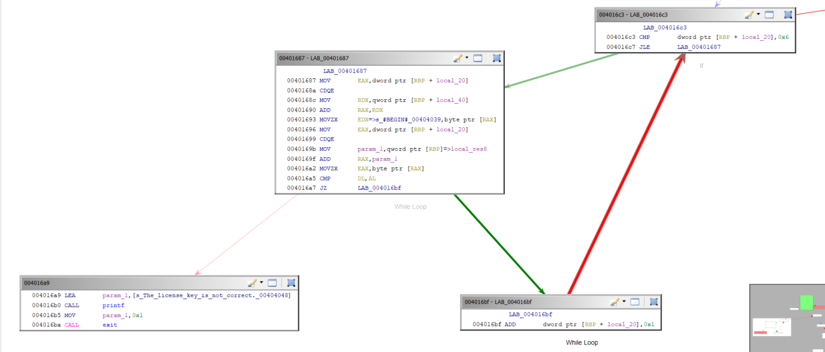 I know they are not legible but don’t worry I’ll take a closer look at these graphs. As you can see above, my guess the heavy work is in the validate_license function probably this function is responsible more than one license control. Now, I will look at the assembly code of the main.