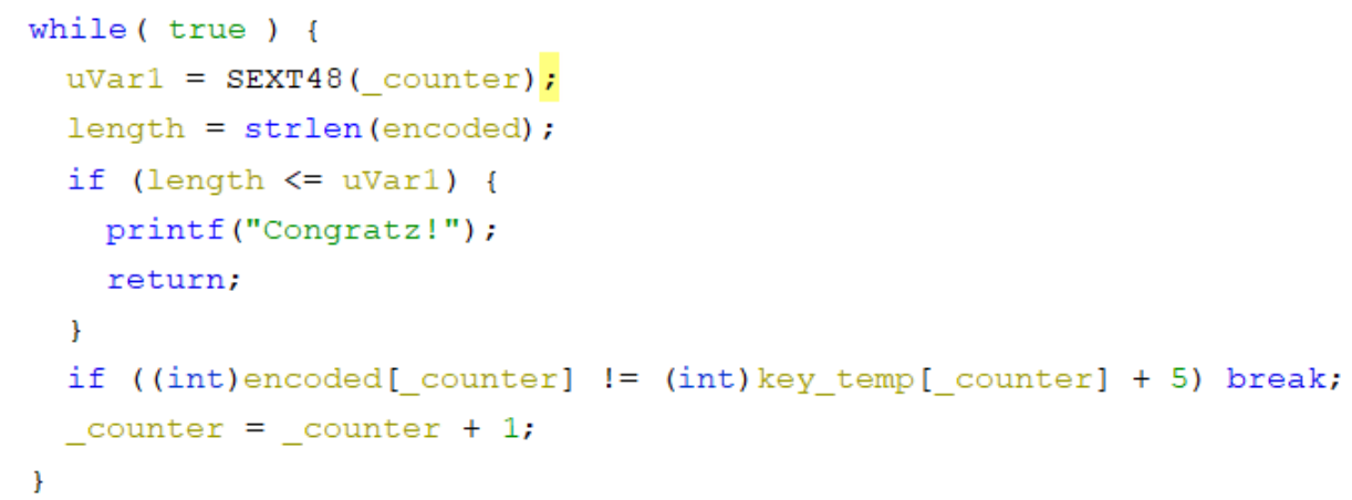 if ((int)encoded[_counter] != (int)key_temp[_counter] + 5) break;