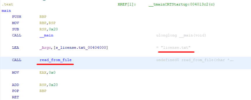 As we know, firstly the prologue part is coming, after that the address of the “license.txt” string is copied to _Argc which is probably the label assigned by Ghidra to ECX register and this variable is the first argument of the read_from_file function. What we know until this step, there is a function named read_from_file and it want probably one argument which is the filename to read of its content. Let’s look at the decompiler window of the main function.