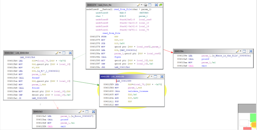 As you can see above, executable probably consists of 3 important functions which are main -> read_from_file -> validate_license. After that, I will look at the graph view of the read_from_file and validate_license functions to understand their size.